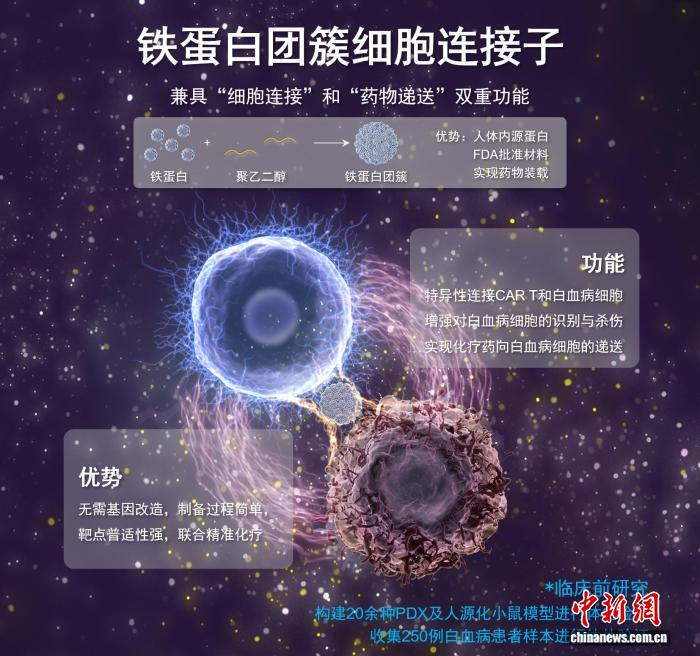 记者从中国科学院过程工程研究所(过程工程所)获悉,中国科学家团队最近创新提出一种兼具“细胞连接”和“靶向递送”双重功能的连接子策略,并创制被形象称为特制“双面胶”的“铁蛋白团簇细胞连接子”(FACE)新剂型,在实验室阶段实现了对白血病CAR T细胞治疗与化疗的高效联合。